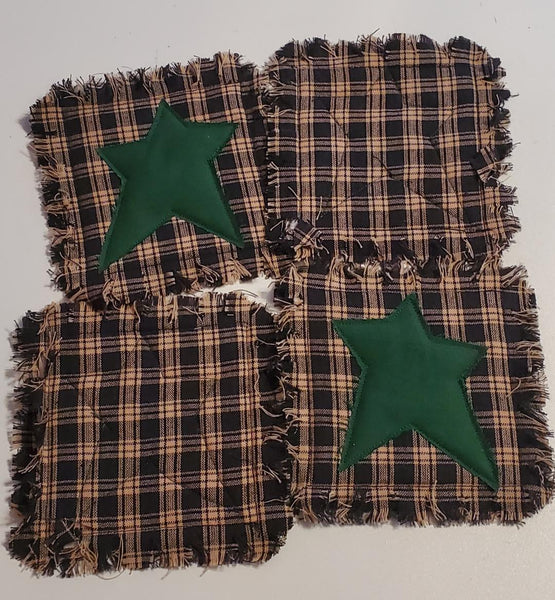 4 Black Plaid w Green Star Homespun Rag Coasters