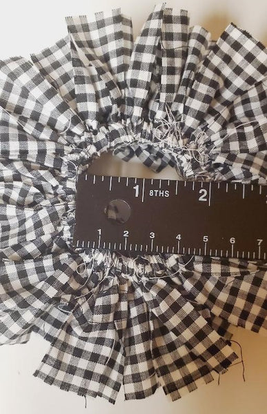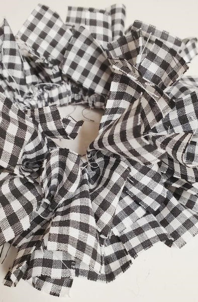 This mini wreath has been handmade with a black and white gingham check fabric that has been hand-tied onto a plastic ring.