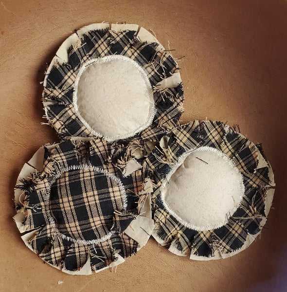 3 black plaid homespun flowers with a homespun center