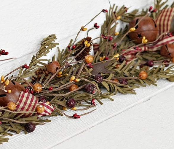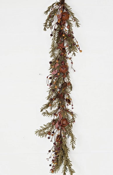 Holiday Pine Christmas Garland with Rusty Tin Bells Gingham Bows